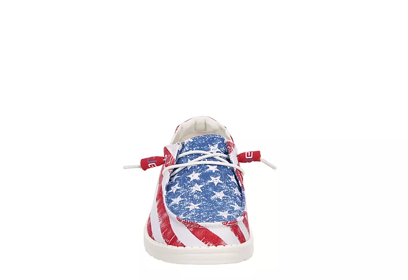 Relax into your passion with the HEYDUDE Wendy women’s slip on. With a printed canvas upper featuring a wide, comfortable fit, these red, white and blue HEYDUDE shoes are machine washable for easy maintenance. The removable Memory Foam insole and leather lining offer ergonomic comfort and cushioning while the ultralight outsole sets you free to explore unfettered.