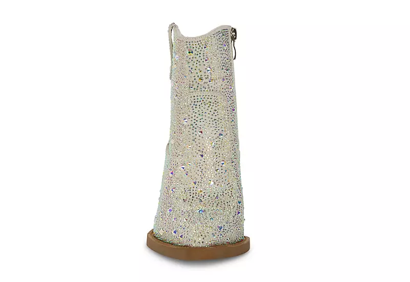 Step up your fashion game with the Jolene women’s Western boot from Madden Girl. With a sparkly rhinestone sequined upper featuring an inside zipper for a convenient fit, this Western boot, with its stylish pointy toe and 3″ block heel, will be an absolute head-turner. A cushioned footbed will soothe your feet, while the synthetic outsole provides excellent grip and stability.
